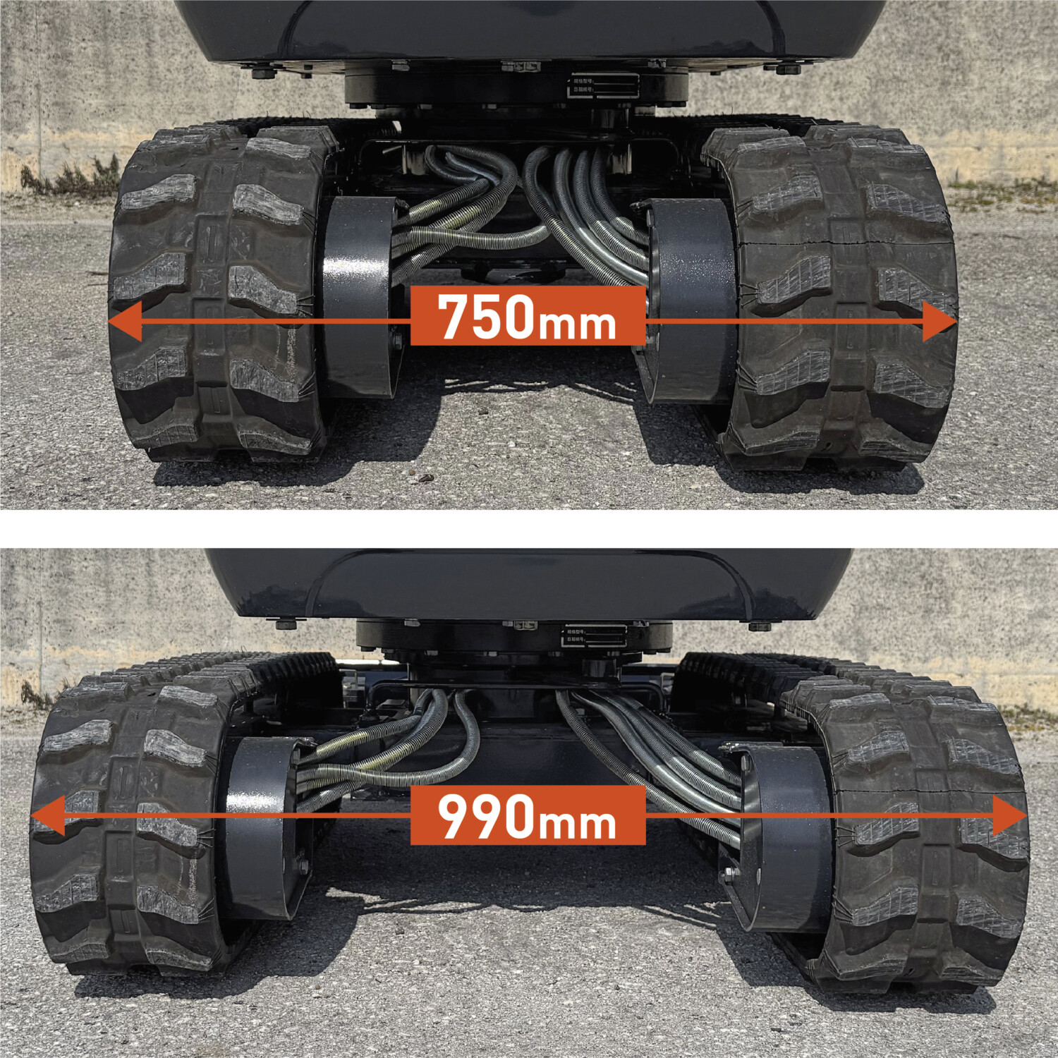 Con l’azionamento di una sola leva, l’Airone 100 PRO può ridurre idraulicamente la larghezza del carro in pochi secondi fino a 750 mm per facilitare l’impiego in spazi ristretti. Viceversa, allargando il carro alla massima estensione di 990 mm, si aumenta di circa il 20% la stabilità, ottenendo un più elevato livello di sicurezza anche quando si lavora col martello demolitore idraulico.